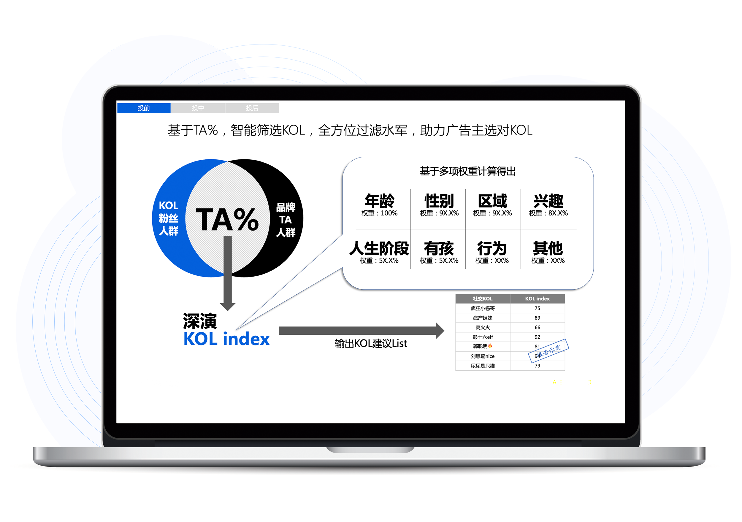 尊龙凯时智能K参谋将品牌TA人群同各大KOL真实互动人群进行重合度分析,尊龙凯时智能K参谋将找到最适合的目标KOL,品牌方再不用被选择KOL类型还是头部大V而困扰